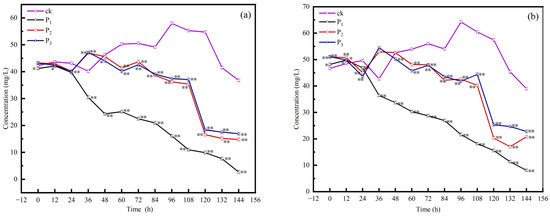 Effect of filler particle size on NO3−-N (a) and TN (b) removal rate. P1 particle size: 0.5–1 mm; P2: 2–3 mm; P3: 5–10 mm. Statistically significant differences compared to the control group are indicated by * (p < 0.05) and ** (p < 0.01) in the graphs.
