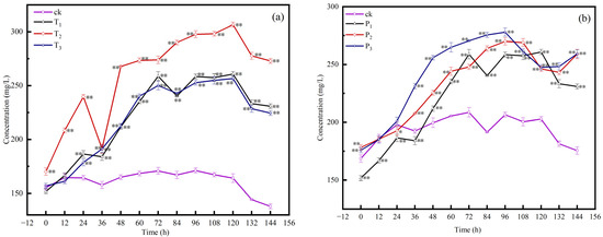 Effect of fillers on sulphate accumulation in wastewater (a); Effect of particle size on sulphate accumulation in wastewater (b). Accumulation of sulfate during autotrophic denitrification. T1: filler: magnetic pyrite: quartz sand = 1:1; T2: quartz sand; T3: magnetic pyrite. P1 particle size: 0.5–1 mm; P2: 2–3 mm; P3: 5–10 mm. Statistically significant differences compared to the control group are indicated by * (p < 0.05) and ** (p < 0.01) in the graphs.