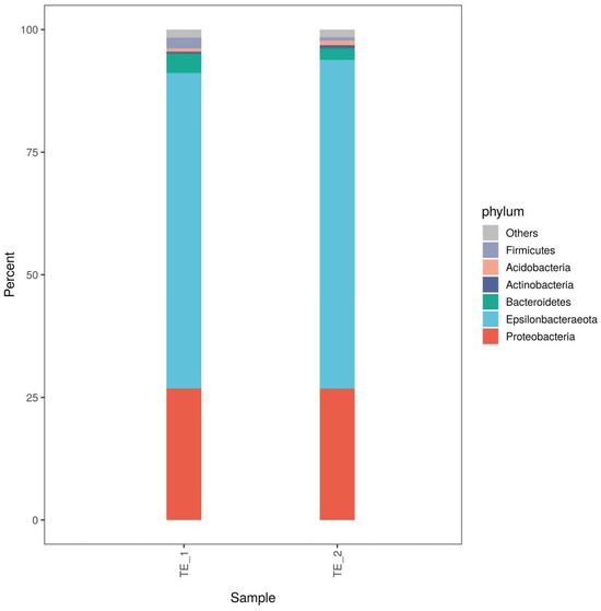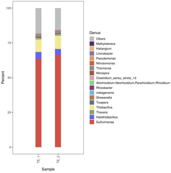 In Figure 6, we present the bacterial community composition of the screened sludge. The dominant phylum was Epsilonbacteraeota, with an average abundance of 65.83%, followed by Proteobacteria, Bacteroidetes, and Acidobacteria, with average abundances of 26.88%, 3.40%, and 0.86%, respectively. The four dominant taxa of bacteria accounted for 96.97% of the total community. Epsilonbacteraeota was initially discovered as a pathogenic bacterium, and then gradually discovered in some extreme environments with the development of gene sequencing technology. Most of the Epsilonbacteraeota phylum are inorganic chemo energetic autotrophic microbial populations that are capable of redox metabolism of NO3− and NO2− using reduced state sulfur [22]. The results of the study by Men et al. [23] showed that the dominant phylum was Proteobacteria and Planctomycetes, all of which were able to maintain high relative abundance. In the study by Wen et al. [18], Betaproteobacteria and Epsilonproteobacteria were the dominant phyla in the system, corresponding to relative abundances of 49.35% and 13.66%, respectively. Experiments by Ma et al. [24] showed that Proteobacteria (42.24–51.49%), Chloroflexi (17.37–23.01%), and Planctomycetes (19.26–22.88%) were the top three clades in the running system. In comparison, among the strains screened in the present study, Epsilonbacteraeota had the highest abundance (65.83%) followed by Proteobacteria (26.88%).