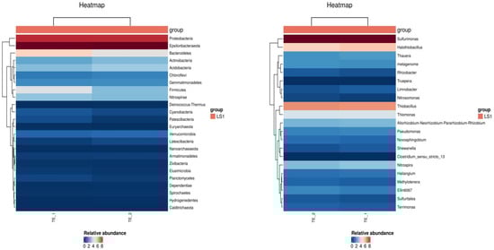 Thermal map of relative abundance of samples at phyla and genus levels.