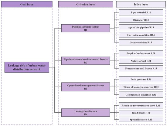 After determining the risk level and corresponding evaluation indexes for the evaluation space, researchers utilized geographic information data from specific regions of the pipeline network system, along with authentic maintenance records and extensive literature. This data was used to classify the evaluation indexes of the index layer, taking into account the risk levels within the evaluation space. This classification was performed either qualitatively or quantitatively. A comprehensive system for assessing the risk of pipeline leakage is provided in Table 1 and Figure 1. The damage ratio was determined using a quantitative classification method that took into account the maintenance records of the affected area. The damage ratio for each pipeline diameter was calculated by taking the ratio of the number of leakage accidents to the percentage of pipe length. The resulting damage ratio value was then classified into five ranges, ranging from low to high.