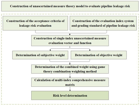 The process of developing a model for evaluating the risk of pipeline leakage, based on the theory of unascertained measure, is shown in Figure 2. The final risk level of the pipeline can be determined by referring to the evaluation space and the measured values of each index for the respective pipeline.