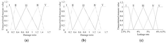 A single index measure function was established for each evaluation index, utilizing the unascertained measure definition and the evaluation index system. The commonly used linear distribution unascertained measure function was applied in this study, expressed as Formula (2). By inputting the measured values of the evaluation index into their respective measure functions, we yielded unascertained measure values for each index, corresponding to different evaluation levels. These values are represented as s-dimensional vectors . By combining ‘m’ s-dimensional vectors, the single-index unascertained measure evaluation matrix for the specific pipe section could be constructed.