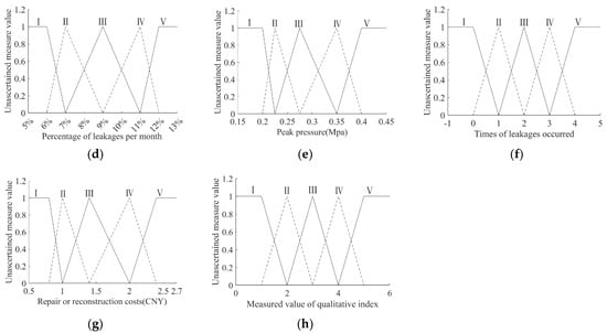 Single-index measure function diagram. (a) Diameter (R12). (b) Age of the pipeline (R13). (c) Depth of embedment (R21). (d) Temperature and frozen (R23). (e) Peak pressure (R31). (f) Times of leakages occurred (R32). (g) Repair or reconstruction costs (R41). (h) Qualitative index value.