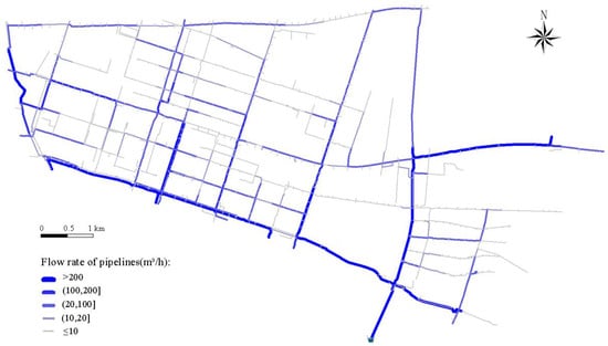 The M region is located in the city of W, located in the middle and lower sections of the Yangtze River in China. The UWDN in the M region consists of a three-level partition of the UWDN for the entire city. The service area of the UWDN is roughly 33.94 km2, delivering an average daily water supply of around 48,000 m3, with pipelines above DN100 totaling about 212.9 km in length. Figure 4 depicts the hydraulic model topology. The non-revenue ratio in March 2023 was 19.48%. It is imperative to evaluate the hazard of pipeline leaks and perform the targeted detection and maintenance of pipeline sections with a high potential for leakage.
