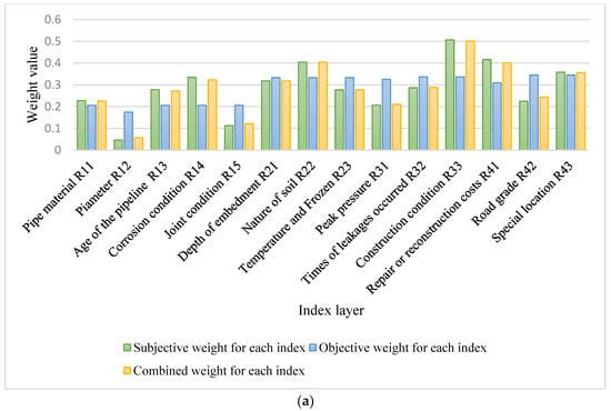 By utilizing both the subjective weight value and the objective weight value for the ‘P01739’ pipe section, the combined weight for each index can be determined by the game theory combination weighting method according to the equations shown in Formulas (4)–(7). Detailed information such as subjective weight, objective weight, and combined weight are shown in Table 4 and Figure 5.