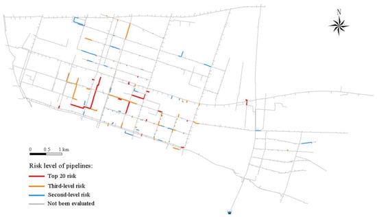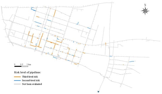 The risk of the remaining pipe sections was evaluated using the same method, resulting in the evaluation of 141 sections. As is shown in Figure 6, out of the total, 84 sections of pipe were classified as having a third-level risk, while 57 sections of pipe were identified as having second-level risk.