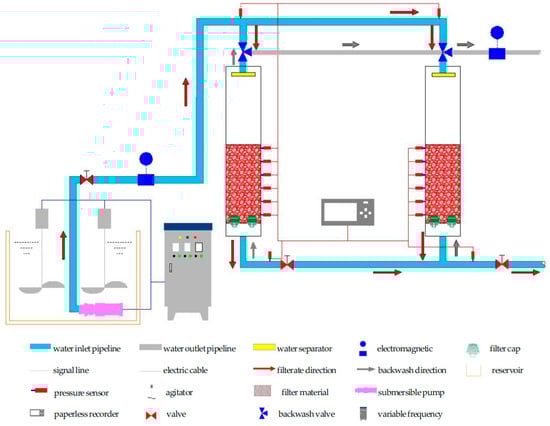 The model experiment was conducted at the Water Saving Equipment Research and Development Center, Institute of Agricultural Irrigation, Chinese Academy of Agricultural Sciences. The filtration system adopted a variable frequency and constant pressure water supply method, with valves (South Asia Plastics Industry Co., Ltd., Taiwan, China) and electromagnetic flow meters (Hangzhou Meikong Automation Technology Co., Ltd., Hangzhou, China) installed on the pipeline for flow rate regulation and monitoring. The filter column model was proportionally scaled based on the sand media filter product, using a transparent organic glass column with inner diameter of 220 mm and height of 1200 mm (Xiamen Sanli Plastic Pipeline Co., Ltd., Xiamen, China) for easy observation of internal water flow and blocking conditions. The interior of the filter column was filled with uniform quartz sand media, and filter caps were installed at the bottom. The pressure-measuring hole was set on the side of the organic glass column to observe the internal head loss of the filter. The water separation plate was installed at the top of the filter chamber to prevent water flow from scouring the filter layer. Under the action of the water separation plate, sand-containing water entered the model, and filtered water flowed out through the filter cap. The supporting facilities for the experiment included frequency conversion cabinets (Delixi Electric Appliance Co., Ltd., Shanghai, China), paperless recorders (Hangzhou Liance Automation Technology Co., Ltd., Hangzhou, China), pressure sensors (Hangzhou Liance Automation Technology Co., Ltd., Hangzhou, China), etc. The overall layout of the model experiment is shown in Figure 1.