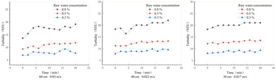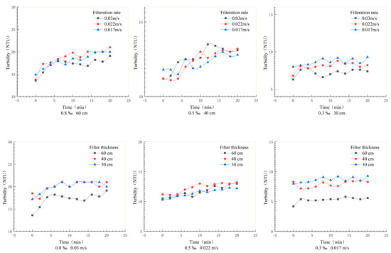 Figure 2. The turbidity of water samples varies with time under different filtration rate, filter thickness, and raw water concentration conditions.