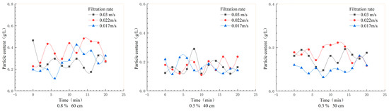 The variations in particle content in water samples over time under different filter thickness, filtration rate, and raw water concentration conditions are shown in Figure 3. As shown in the figure, with an increase in filtration rate, there were no significant differences in particle content in the filtered water samples under different treatment conditions. The particle content in water samples showed dynamic changes over time and fluctuated within a certain range. By assuming the particle content in the filtered water samples as an indicator to evaluate the filtration effect, different filtration rates did not significantly impact the filtration effect, and changes in filtration rate had a weaker impact on particle content in the filtered water samples. When the raw water concentration and filtration rate were the same, as the filter thickness increased, the particle content showed dynamic change over time. The particle content in the water samples with a filter thickness of 60 cm showed an obvious difference compared with the samples filtered using the other two filter layer thicknesses, while the difference in particle content between the latter water samples was not obvious. When the raw water had a particle concentration of 0.8‰, the particle content in the filtered water samples was obviously higher than that under the other two raw water particle concentration conditions. When comparing the dispersion degree of particle content values in water samples under different treatment conditions, it was found that there was a significant difference in the standard deviation of particle content values in the filtered water samples as the raw water concentration increased. It is assumed that the more stable the particle content index of a filtered water sample is, the better the filtration effect is. It was determined that the filtration effect was significantly different with an increase in raw water concentration.