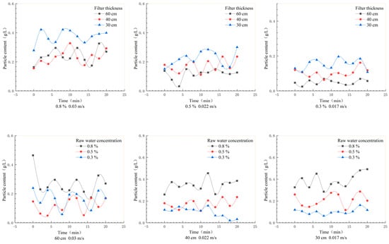 Figure 3. The content of water particle content with time under different filter thickness conditions, filtration rates, and filter thickness and raw water concentrations.