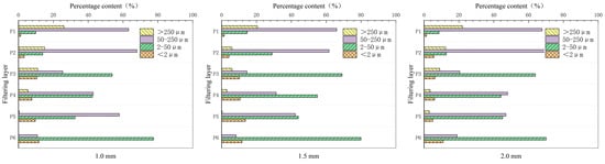 In order to analyze the distribution characteristics of intercepted particles in the filter layer, we referred to the sediment particle size classification standard formulated by the United States Department of Agriculture (USDA): clay particles (d ≤ 2 μm), powder particles (2 μm < d ≤ 50 μm), fine sand (50 μm < d ≤ 250 μm), medium sand (250 μm < d ≤ 500 μm), and coarse sand (500 μm < d ≤ 2000 μm) [28]. None of the sediment particles used in this test were coarse sand, so only the remaining four types of particles were analyzed. The distributions of sediment particle sizes in the filter layer under different filter particle size conditions are shown in Figure 4. From the figure, it can be seen that the particle size distribution trend of sediment in the upper half of the filter layer was the same as that of raw water, with the highest content of fine sand, medium content of medium sand and powder particles, and the lowest content of clay particles. As the depth of the filter layer increased, the distribution of sediment particle sizes changed: the content of fine sand gradually decreased, and the content of powder particles gradually increased, while the content of medium-sized sand did not change. As the depth of the filter layer increased, the characteristics of the intercepted sediment showed an increasing trend for large-sized sediment, a decreasing trend for small-sized sediment, and an increase in the content of powder particles and fine sand. The sediment distribution trends at the same depth under different filter particle size conditions were relatively similar to each other, but the sediment distributions were quite different at different depths of the filter layer. Under the condition of the same filter particle size, the distributions of sediment particle sizes in the filter layer are shown in Figure 5. From the figure, it can be seen that the particle size distributions of different filter layer sections with the same particle size are compared: the greater the depth of the filter layer section was, the lower the contents of fine sand and medium sand were, and the higher the content of powder particles was; the change in clay content was not obvious.