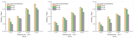The variations in head loss with filtration rate under different raw water concentration conditions are shown in Figure 6. As shown in the figure, the trends of head loss changes under different filter thicknesses were similar. As the filtration rate increased, head loss showed an increasing trend, indicating that there was a positive correlation between filtration rate and head loss. Under the same filter thickness and filtration rate conditions, as the raw water concentration decreased, head loss also decreased. The raw water concentration was positively correlated with head loss, as head loss was obviously reduced when the raw water concentration was 0.3‰ compared with when it was 0.8‰. When raw water concentration and filtration rate were fixed, as the filter thickness gradually increased, head loss just showed a corresponding increasing trend. When the filter thickness and filtration rate were fixed, it was observed that, as the raw water concentration increased, head loss gradually increased.