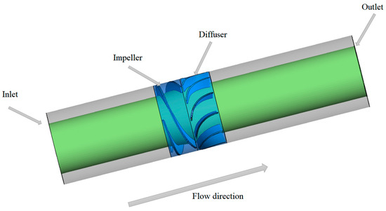 A single blade was intercepted by Ansys Geometry 17.0 to divide the flow channel of the booster unit. Then, the geometric structure of the divided flow channel was imported into the Ansys TurboGrid 17.0 for structural hexahedral mesh division. Ansys ICEM 17.0 was adopted to divide the structural hexahedral mesh of the inlet extension and the outlet extension. Finally, in Ansys CFX 17.0, a impeller and a diffuser were assembled by removing their interface.
