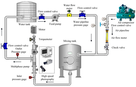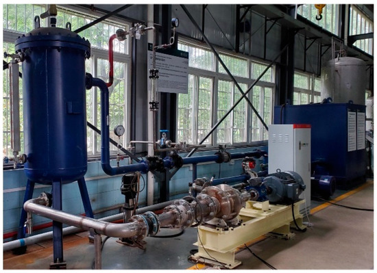 The SABP test bench was designed and built, and the results of the external characteristic test were compared with the calculated outcomes to validate the reliability of the numerical calculation outcomes. Figure 3 shows the SABP booster unit, and Figure 4 shows the SABP test system. Figure 5 displays the schematic diagram of the test system.