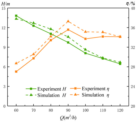 The test outcomes and numerical calculation outcomes of the rotational speed of 3000 r/min and tip clearance of 1 mm were drawn into the external characteristic curve, as shown in Figure 6. The relative error between the test outcomes of head and efficiency and the numerical calculation results is less than 5%, which indicates the reliability of the numerical calculation outcomes.