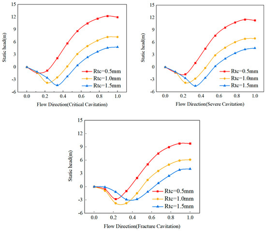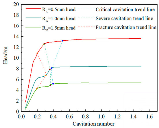 When Rtc = 0.5 mm, the pump head reaches 13.63 m without cavitation. The critical cavitation point is reached in the case of the cavitation number of 0.52, the stage of severe cavitation is reached in the case of the cavitation number of 0.29, and the fracture cavitation point is reached in the case of the cavitation number of 0.2.