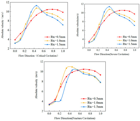 In the fracture cavitation stage, the absolute velocity of the 1.5 mm tip clearance in the flow direction from 0 to 0.4 exceeds 1.0 mm tip clearance, and the distribution law of the larger tip clearance and the smaller absolute velocity maintained in the first two cavitation stages resumes after 0.4.