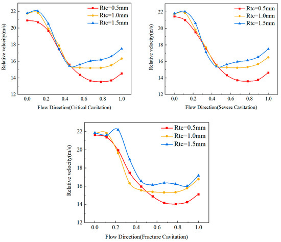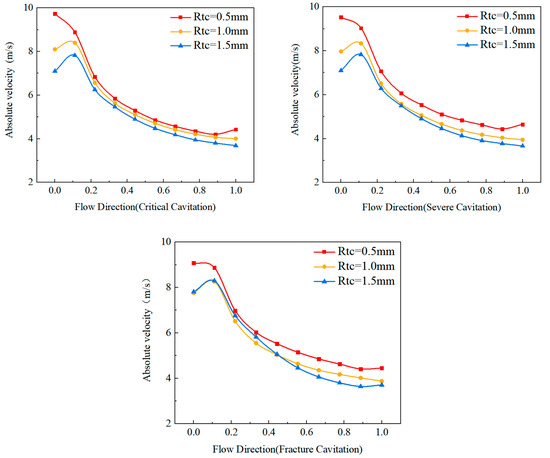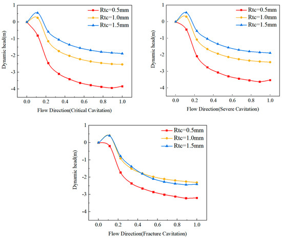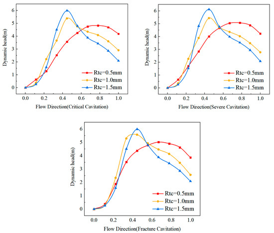 When Rtc = 1.0 mm, the pump head without cavitation decreases with the cavitation number and reaches the critical cavitation point in the case of the cavitation number of 0.38, develops to the severe cavitation stage in case of the cavitation number of 0.36, and reaches the fracture cavitation point when the cavitation number is 0.31.