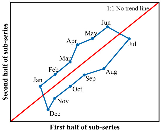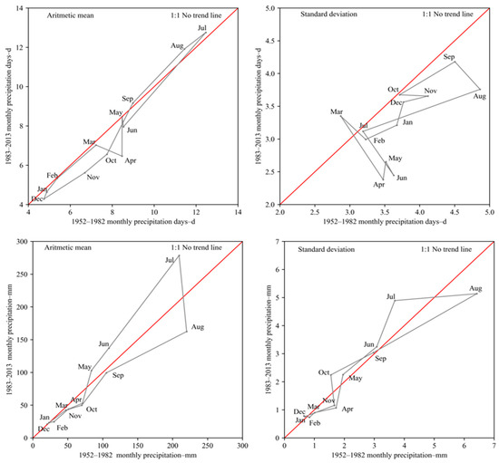 In this study, IPTA was applied to analyze monthly precipitation and monthly precipitation days data. The data for monthly precipitation and precipitation days were organized in a rectangular matrix format. Each row of the matrix represents the amount of precipitation or precipitation days for each month of the year, denoted as X1,n, X2,n, …, Xi,n, where i represents the month, and n represents the year. The matrix can be divided into two halves: the upper (first) part and the lower (second) part. The upper part corresponds to the indicator j as j = 1, 2, …, n/2, and the lower part corresponds to j = n/2 + 1, n/2 + 2, … n. The mean value and standard deviation of the upper and lower parts of the matrix are then calculated to obtain the mean value and standard deviation of these two series. The Cartesian coordinate system, as shown in Figure 1, is used to plot the average value (or standard deviation) of the upper series on the horizontal axis and the lower series on the vertical axis. This results in 12 points representing the values for the 12 months.