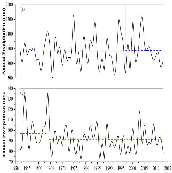 Changes in (a) annual precipitation and (b) annual precipitation days at the Shimantan Reservoir, China. The red solid line is the linear trend of seasonal precipitation and the blue dashed line shows the average lines before and after the year when an abrupt change occurred in annual precipitation and annual precipitation days.