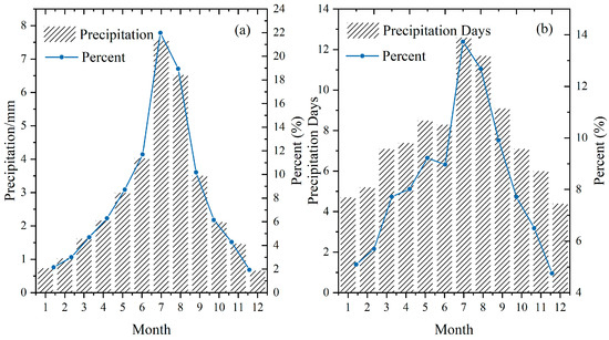 Monthly variation in (a) precipitation amount and (b) precipitation days from 1952–2013 at the Shimantan Reservoir, China.