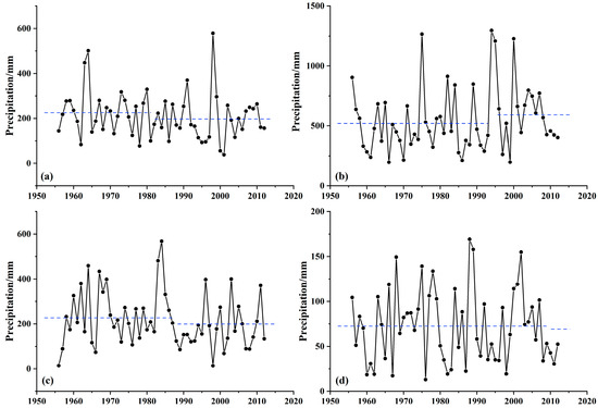 Seasonal precipitation (i.e., (a) spring, (b) summer, (c) autumn, and (d) winter) changes at the Shimantan Reservoir, China. The blue dashed line represents the average level of each season’s precipitation before and after the year when an abrupt change occurred.