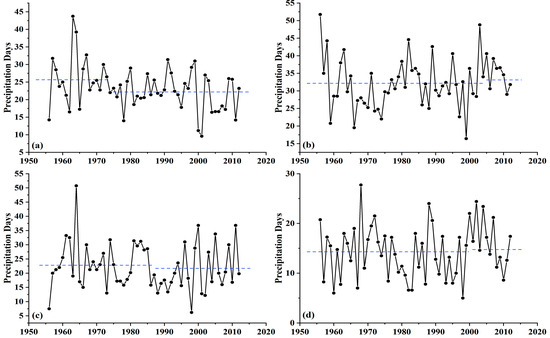 Seasonal precipitation days (i.e., (a) spring, (b) summer, (c) autumn, and (d) winter) changes at the Shimantan Reservoir, China. The blue dashed line is the average of lines before and after the year when an abrupt change occurred in each season’s precipitation.