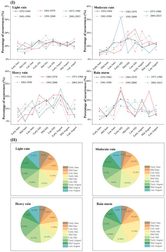 (I) Intra-annual changes in occurrence percentages of rainfall events of different levels for different decades and (II) statistics on the average occurrence percentages of different levels’ rainfall events for the entire study period at the Shimantan Reservoir, China. The percentage indicates the average proportion of the number of rainfall events occurring during a specific period, such as early June, compared to the total number of occurrence times for the selected period.