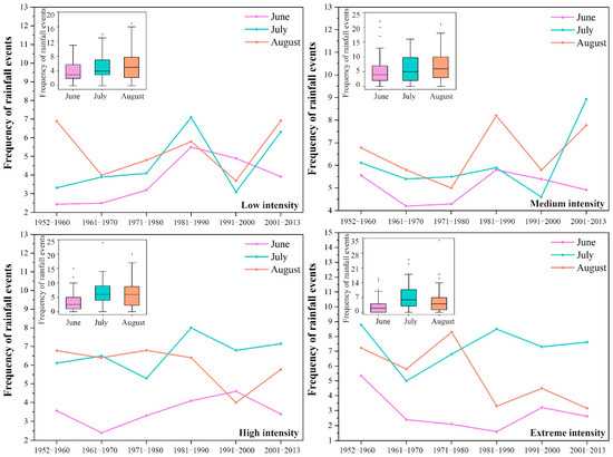 Decadal changes in the frequency of rainfall events with varying intensities at the Shimantan Reservoir, China. The box chart represents the distribution of rainfall event frequencies with specific intensities observed in the months of June, July, and August. The frequency refers to the number of times rainfall events occur in different months.