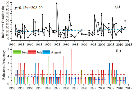 Changes in (a) rainstorm duration and (b) rainstorm frequency at the Shimantan Reservoir, China. In (a), the blue dashed line represents the trend line of rainstorm duration. In (b), the green dashed line, the red dashed line, and the blue dashed line represent the trend lines of rainstorm frequency in June, July, and August, respectively.