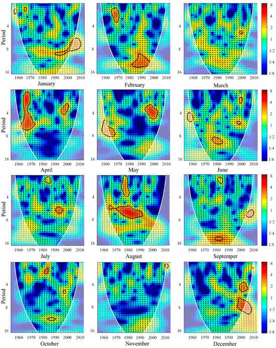 Cross-wavelet power spectra and coherent spectra were also applied to make a comprehensive description of the relationship between AO and monthly precipitation at the Shimantan Reservoir, and the results are shown in Figure 10. In Figure 10, the thick black lines, represented by circles, signify the areas that have passed the significance test against red noise at a 0.05 level, while the white lines represent the boundaries of the wavelet influence cones. The phase differences between the two series are indicated by arrows in the figures. Arrows pointing to the right suggest that AO and monthly precipitation are in phase, and there is basically a positive correlation between them. Meanwhile, arrows pointing to the left indicate that the two series are out of phase or they have a negative cyclical effect on each other. Arrows pointing down indicate that the change in AO is ahead of the change in precipitation by π/2 phases, with a corresponding time of 3 months, while arrows pointing up indicate that the change in the AO is posterior to the change in precipitation by π/2 phases (i.e., 3 months).