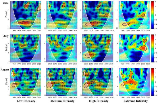 The cross-wavelet power spectra and coherent spectra of the EASM and the frequency of summer rainfall intensity at the Shimantan Reservoir are shown in Figure 11. A negative correlation can be found between the EASM and the frequency of summer rainfall intensity at the Shimantan Reservoir during the study period, and an oscillation with a large span of 2–12 years was exhibited (Figure 11). The correlation varied among different months and levels of rainfall intensity. The oscillation period changed irregularly in June and July, while in August, the correlation between rain intensity frequency and the EASM increased with the increase in rain intensity frequency. When it rained with medium or high intensity, the time–frequency variation was clearly consistent among these three months. However, the consistency was destroyed when it came to precipitation of low or extreme intensity. Under a comprehensive analysis of these findings using the geographical location of the study area and the characteristics of the EASM, it is possible to speculate that the differences in the correlations between the two indices may be related to the transport intensity of the southerly monsoon and different locations of water vapor convergence.