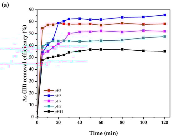 The influence of contact time on the arsenic (III) adsorption capacity of the 50:50 ZnO-CuO nanocomposite was evaluated at varying pH levels, as depicted in Figure 5a. It was evident that the amount of arsenic adsorbed rapidly increased during the initial stages of contact between the adsorbate and the adsorbent. This was followed by the attainment of adsorption equilibrium after 120 min for all tested pH conditions. The initial rapid uptake indicates fast diffusion and accessibility of the arsenic species to the binding sites on the nanocomposite surface. The plateau after 120 min signifies saturation of the available adsorption sites. The fast adsorption kinetics are beneficial for potential applications, as they would require shorter residence times.