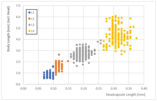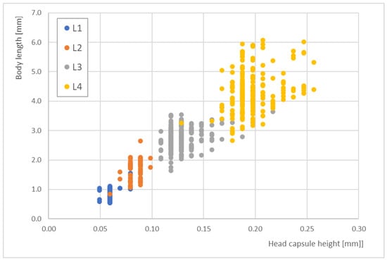 Figure 5 shows the distribution of head capsule heights for the different larval stages, which was ≤100 µm for L1 and L2. Across all stages, the distribution ranged from 0.05 to 0.25 mm. Larval stages L1 and L2 strongly overlapped at a head capsule height of 0.07 mm. Additionally, some L3 and L4 data demonstrated strong scattering.