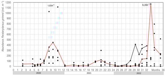 P. grimmii development in the DWDS in Northern Germany clearly showed oscillations in their abundance, with the highest values occurring in late summer/autumn. In the winter/spring period, larvae density dropped to less than 40 individuals per m