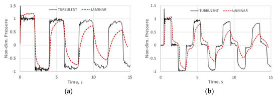 In both the laminar and turbulent cases, the peak positive and negative values decrease monotonically in time. This is a natural consequence of the dissipative influences of viscous phenomena, both quasi-steady and unsteady. However, it is also seen that the decay in amplitudes is stronger at the mid-pipe than at the valve, especially in the laminar flow case. At first sight, this might seem counter-intuitive, but it is a natural consequence of the ever-increasing length in the wavefront that has been influenced significantly by the unsteady component. When this length exceeds the length of the pipe, the superposition of the wavefronts propagating in opposite directions prevents the development of the complete pressure changes associated with the individual wavefronts. This effect is discussed more fully in Section 8 below.