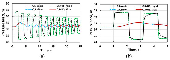 Figure 3 shows theoretical predictions of pressure histories from a study described by Vítkovský et al. [11] caused by rapid and slow valve closures in a turbulent pipe flow. This enables the relative influences of the quasi-steady (QS) and unsteady (US) contributions to be assessed. Using the discussion on Figure 1 above, it can be inferred that the damping is caused primarily by the quasi-steady component, whereas the distortion of the leading part of the wavefront is caused primarily by the unsteady component. Moreover, in common with Figure 2 above, successive wavefront reflections arrive at intervals that are shorter than those needed for vorticity diffusion to enable cross-sectional velocity profiles to approach quasi-steady conditions closely. With the slower valve closure, the differences between predictions with and without unsteady friction are less obvious visually than for the rapid closure. This is consistent with expectations discussed above in relation to timescales, but these histories are also strongly influenced by the superpositions of successive wavefronts.