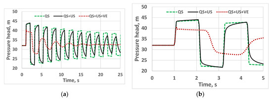 The consequences of this for water-hammer phenomena are illustrated in Figure 4, which again uses data obtained in the study reported by Vítkovský et al. [11]. The graphs showing the influence of quasi-steady (QS) and unsteady (US) components of skin friction are the same as those in Figure 4. By inspection, these are much less important than the influence of the assumed visco-elastic (VE) properties of the pipe wall. Indeed, the latter is so dominant that little useful purpose would be served by taking account of unsteady components of skin friction in analyses of water-hammer in pipes with wall properties such as these (although quasi-steady friction will still be influential in long pipes). In a research context, it will be rare for reliable deductions to be made about unsteady friction from measurements made in such pipes. This is the case even though the prevailing shear stresses will be comparable to those in nominally rigid or linearly elastic pipes. However, it is also true that the existence of unsteady friction will reduce somewhat the accuracy with which the visco-elastic effects themselves can be deduced.