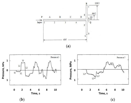 So far, it has been implicitly assumed that the initiating event primarily causes a disturbance in the fluid and that the consequential response of the pipe is of secondary importance. However, this is not always the case. Externally induced shaking of pipes, e.g., in earthquakes, causes structural movements that can have strong consequences for the pressure change. Figure 6 shows an extreme example described by Vardy et al. [15] in which the initiating disturbance was induced structurally, not hydraulically, by the axial impact at a closed end of a pipe. The main experiments were undertaken with the T-piece configuration shown in Figure 6a, but preliminary measurements were made with only a single pipe, with the junction replaced by a closed end. Figure 6b shows the pressure measurements at the mid-length of the single pipe. Waves in the liquid and solid are denoted by ‘L’ and ‘S’, respectively. By inspection, the initial axial stress wave (S1) arrives long before the pressure wave (L1), and so does the reflection (S2) of the stress wave from the remote end. Its subsequent reflection (S3) from the impact end arrives shortly afterwards. The pressure wavefront L2 is a disturbance moving upstream, having been generated when the stress wave S1 reflected at the remote end. It is noteworthy that the magnitude of this wavefront exceeds that of L1. A further important feature of the figure is that the maximum and minimum pressures occur long after the initial pressure wave and its first reflection. This illustrates the potential for a dispersive effect to cause amplification, not damping.