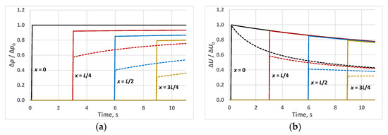 A related difficulty illustrated in Figure 4 arises when wavespeeds need to be inferred from experimental measurements. In this context, however, the appropriate interpretation of the term ‘wavespeed’ tends to be context-dependent. As discussed by Tijsseling and Vardy [12], it is important to distinguish between speeds at which small disturbances travel (i.e., the speed of sound relative to the fluid) and the speed at which large disturbances appear to travel (e.g., distances moved by wave crests in a given time). Using the latter, the intervals between successive reflections in the elastic-walled pipe case are clearly distinguishable from the instants when the pressures begin to fall. The same is not true, however, in the case of visco-elastic pipes. The interval between the start of the first two maxima is reasonably distinct, but the intervals between the succeeding maxima are less distinct. Moreover, the intervals between the successive maxima increase with time and the extent of the overlap between each wave and its reflection also increases. As a consequence, if physical measurements were of this form, it would not be safe to infer the wavespeeds from the time intervals between the maxima. When such behaviour is interpreted in the frequency domain instead of the time domain, the wavespeed is said to be frequency-dependent (e.g., Aliabadi et al. [13]