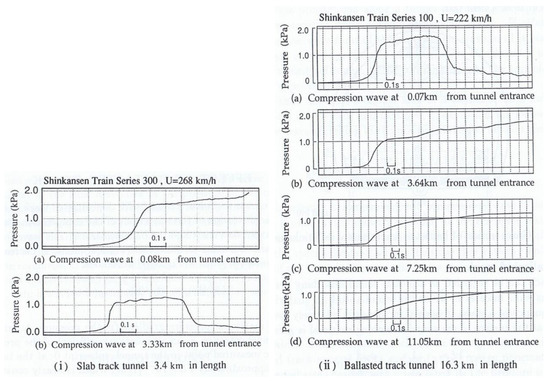Compression waves in long, ballast-track and slab-track tunnels (after Ozawa et al. [16]. N.B.: The strong pressure reduction at 3.33 km in the slab-track tunnel is a reflection from the tunnel exit portal whereas the strong reduction at 0.07 km in the ballast-track tunnel occurred when the train nose passed the sensor).