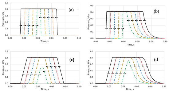 A simple message to be taken from this description is that wave superpositions can have a strong influence on pressure histories at any particular location. In this example, each ramp is linear, so the effects are easily seen. In practical applications, however, wavefronts rarely approximate closely to linear and the consequences of superpositions can be less obvious. Another important observation from Figure 10 is that the magnitudes of successive maxima and minima are not affected by the superpositions, and neither are the rates of the change in the pressure of the individual wavefronts. Therefore, although the superpositions can complicate the interpretation of the physical measurements exhibiting damping, they are not, in themselves, a cause of the damping of individual waves even though, at one location illustrated in Figure 10, they cause a big reduction in the amplitudes.