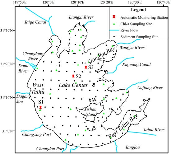 Lake Taihu and locations of monitoring stations, Taihu Laboratory for Lake Ecosystem Research chlorophyll-a sampling sites, inflows, outflows, and sediment sampling sites.