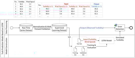 For each station, each raw time series dataset (e.g., wind speed or turbidity) was normalized and transformed into a supervised learning dataset using walk-forward validation [30] (Figure 2). The transformed dataset was further split into a training set, a validation set and a test set, which were used for training, evaluation, and error detection, respectively. During data processing, the input time window (2–16 h) and the size of the training set (600–9000 sets) were adjusted continuously to determine the optimum solution for the initial input data.