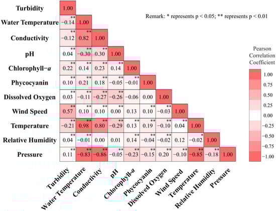 The Pearson correlation analysis method could be used to select the influencing factors of the predicted variable [31,32]. Therefore, we calculated the Pearson correlation coefficients between the different environmental variables measured at S2. As shown in Figure 4, the turbidity is positively (negatively) correlated with Chl-a, pressure, and wind speed (temperature). The correlation coefficient between the wind speed and turbidity was the largest (r = 0.57, p < 0.05). Global studies have shown [33,34,35] that wind is the main driving force of sediment resuspension in shallow lakes. Therefore, we developed the LSTM-based turbidity model using synchronous wind speed.