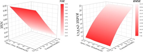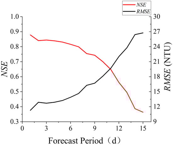 Figure 5 shows the NSE and RMSE values of the LSTM_S2-W1 Scenario, the NSE value decreased and the RMSE value increased with increasing forecast period; the NSE value was below 0.5 and the RMSE value was above 20 NTU at a forecast period of 10 h. However, for LSTM_S2-W2, the RMSE value increased with the forecast period, and reached 20 NTU at a forecast period of 12 days (Figure 7); the NSE value decreased with the forecast period and reached 0.7 at a forecast period of nine days; the rate of the decrease in the NSE value increased considerably for the forecast periods of >12 days.