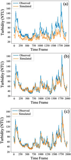 Observed and simulated turbidity based on data collected at S2. Simulated turbidity using different sizes of training set: (a) 600, (b) 3000, and (c) 9000 sets.