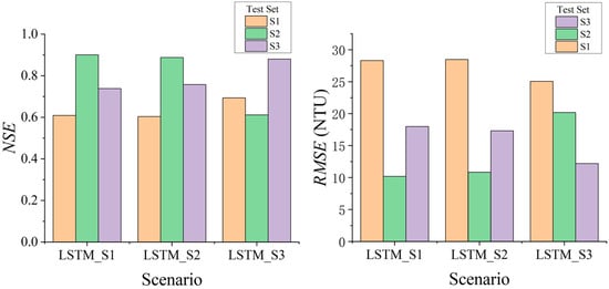 Figure 8 shows the results of the LSTM_S Scenario; the NSE values of all the predictions were >0.6. The performance of LSTM_S1 was similar to that of LSTM_S2. Among the 3 scenarios, the LSTM_S2 performed the best, with a NSE of 0.90 and RMSE of 10.20 NTU. Meanwhile, LSTM_S1 performed the poorest with a NSE of 0.60 and RMSE of 28.30 NTU.