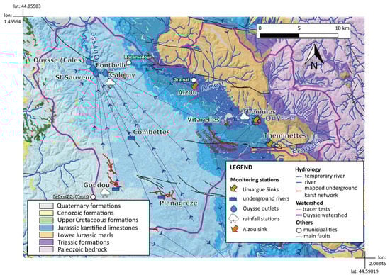 The watershed catches three perennial rivers: the Alzou, the Ouysse, and the Francès. All three flow through the Limargue area (where the marls are outcropping) and sinks as they reach the outcropping carbonates of the Causse area. The catchment areas of the Francès and Ouysse (southeast of the watershed) are mainly runoff from the Limargues (marl) and Segala (Paleozoic bedrock) zones. The Alzou River, located further north in the watershed, is partly fed by a spring that emerges through a fault in the middle of the Limargue marl layers. This water comes from the evaporite aquifer located at the base of the Lower Jurassic and is highly mineralized. (Figure 1). The three rivers show an important variation of flow according to the rain events: the smallest is the Francès river flowrate varying between 1 L.s−1 to 5000 L.s−1, the Alzou river flowrate varies between 20 L.s−1 and 8000 L.s−1, and finally, the Ouysse flowrate varies from 20 L.s−1 to 10,000 L.s−1 []. Several tracer tests have identified the connections between the losses of these three rivers and the springs of Cabouy, Saint Sauveur, and Fontbelle [].